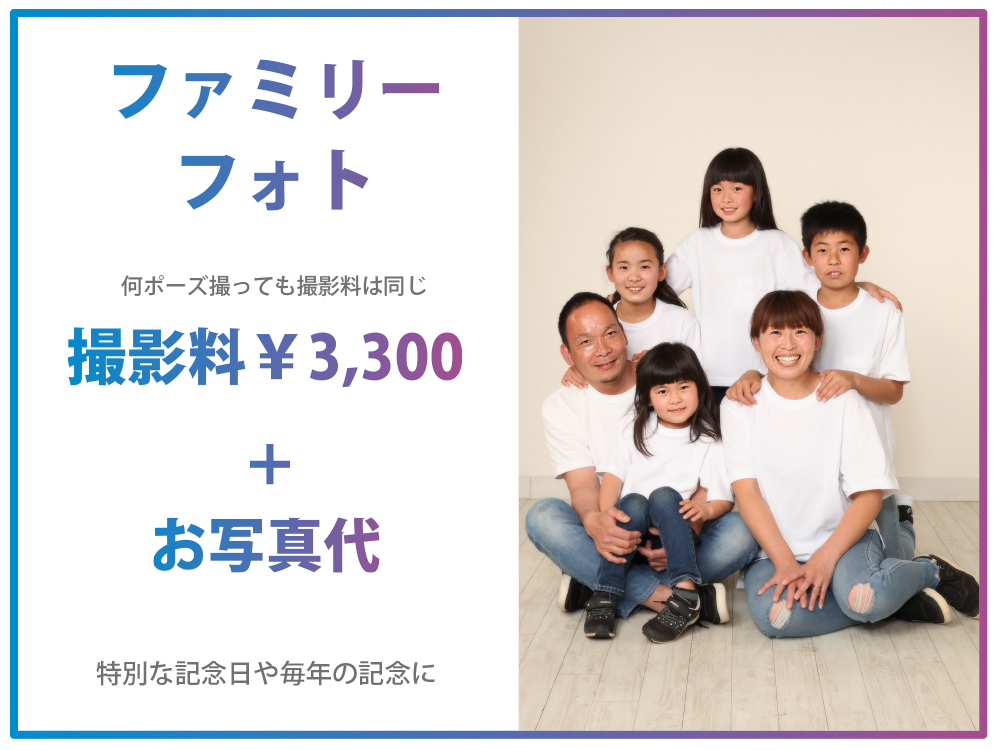 | 台紙写真 | キャビネサイズ¥4,950 六切りサイズ¥6,600/¥5,300 |