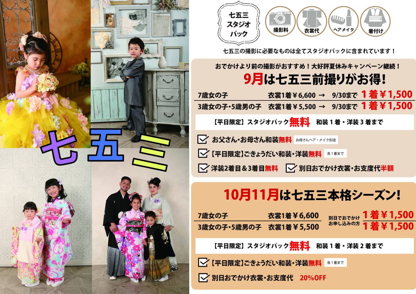 スタジオパックは「撮影料」「衣裳レンタル」「ヘアメイク着付け」の七五三の前撮りに必要なものが全て揃ったセットです